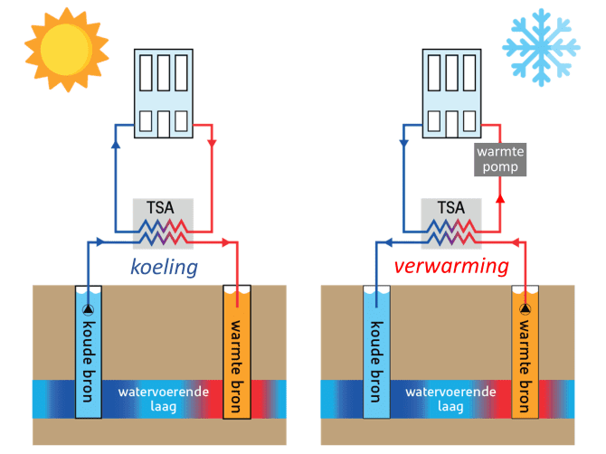 Desondanks is Warmte-Koude-Opslag een goede optie voor duurzame energie in Nederland. Water heeft een erg hoge soortelijke warmte, wat betekent dat er veel energie nodig is om het een paar graden op te warmen of af te koelen. Deze eigenschap maakt water eigenlijk een heel geschikte warmte “batterij”. Het idee van Warmte-Koude-Opslag is dat er diep onder de grond meerdere watervoerende pakketten zijn, die afwisselend koud en warm zijn. In de zomer kan het relatief koele water gebruikt worden om gebouwen mee te koelen, in plaats van een airco te gebruiken.[3] In de winter kan juist het warme water gebruikt worden om gebouwen op te warmen in plaats van het verstoken van gas of andere niet-hernieuwbare energiebronnen. Dit alles kost relatief weinig energie, omdat het koude water in de winter kan worden aangevuld als het omliggende oppervlaktewater koud is. Het warme water kan juist in de zomer worden aangevuld, als de uitstroom van een gebouw warm is. Op deze manier wordt de energie van de zon en onze seizoenen optimaal benut. Het plaatje hierboven illustreert hoe de warme en koude bron gebruikt worden in beide seizoenen.